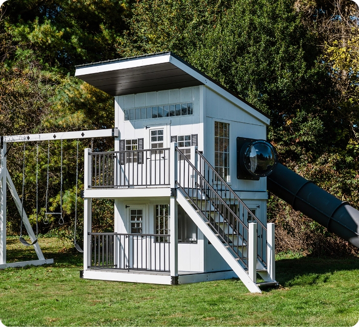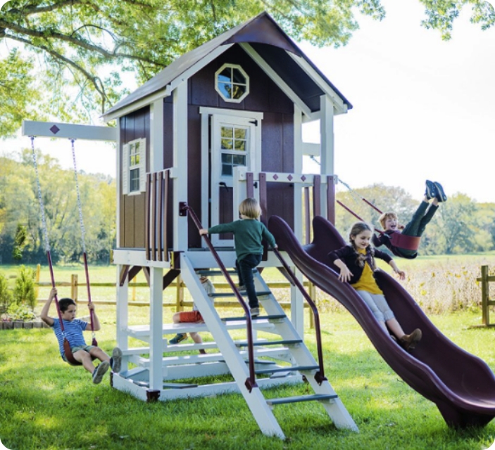 Each element of your playscape is handcrafted to order, right here in the US — with the main structural elements produced for us in the renowned Amish Kingswing manufacturing facility. You’ll get a tracking link so you can follow along as the magic builds. Once ready, we’ll confirm a delivery date.